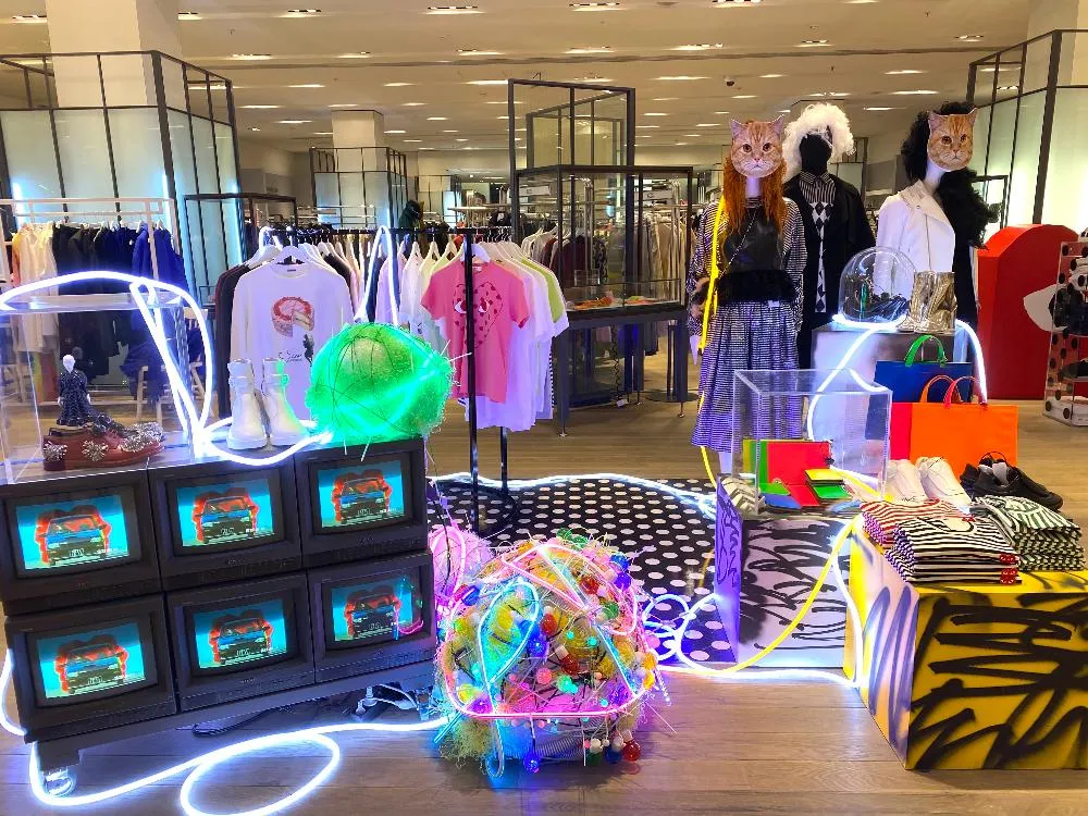Personalmente trabajo con colecciones y espacios y disfruto mucho del trabajo, los objetos de arte para tres ventanas emergentes fueron creados para nosotros por una joven y brutal diseñadora Daria Danilova (una representante típica de Z con su visión no estándar y la falta de límites en creatividad). Trabaja con materiales industriales, y tiene una loca instalación artística de tubos de neón, mangueras y arneses, con la que presentamos la colección Comme Des Garçons Noir Kei Ninomiya de vestidos de noche de tul transparente y seda.