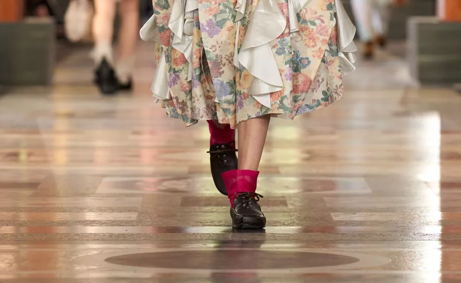 La colección Primavera/Verano 26 de Louis Vuitton reinventa las pantuflas de casa con combinaciones de colores interesantes y calcetines hechos de materiales inesperados y elegantes, como brocado bordado en plata, gasa y seda dorada.