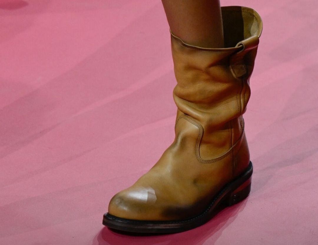 Varias modelos desfilaron por la pasarela con botas de piel de media caña, caña ancha y empeine de piel envejecida. El mismo efecto de piel envejecida se vio también en los zuecos, adornados con detalles metálicos a lo largo de la correa.